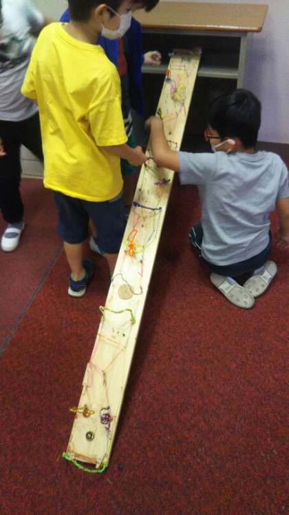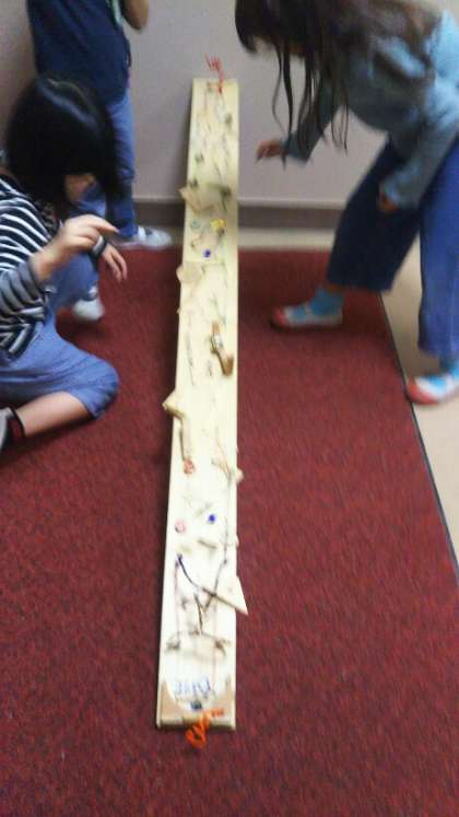 長い板にグループ毎に、げんのうでくぎを打ち、輪ゴムやモール、木切れ等も使ってビー玉がはじかれながら転がるコースをつくりました。