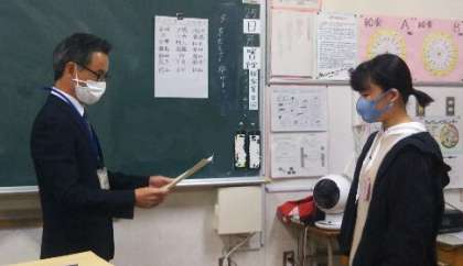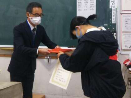その後、教室で賞状と副賞を渡しました。クラスのみんなからは拍手が起きました。