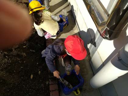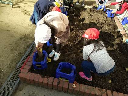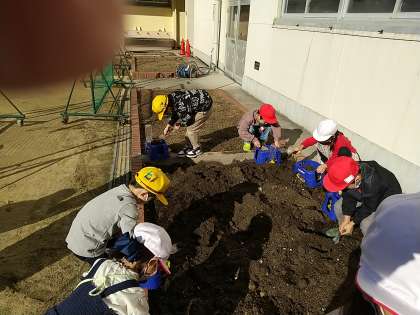 1年生が、チューリップの球根を植えていました。「土のおふとんをかけてあげてね。」という担任の先生の話を聞いて、そぉっと土をかぶせていました。