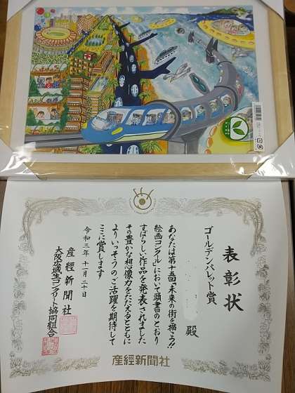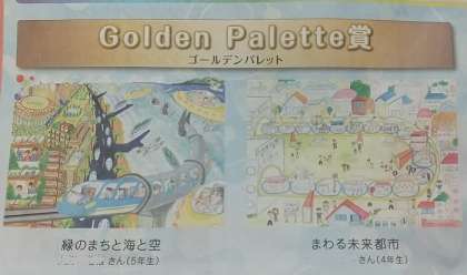 5年生の男子児童が応募した、「未来の街を描こう!!絵画コンクール」で、ゴールデンパレット賞という素晴らしい賞を受賞しました。
