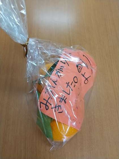 鏡餅にのせたくなる、素敵な葉っぱつきのみかんです。みかんの絵もかわいいね。