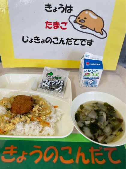 【今日の給食】 ●カツ丼(鶏卵の除去食) ●すまし汁 ●ミニフィッシュ ●牛乳