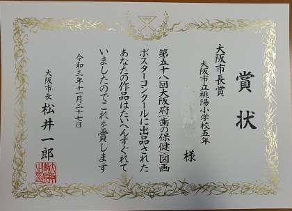 5年生の女子児童が、「大阪府歯の保健図画ポスターコンクールで、大阪市長賞を受賞しました。おめでとうございます。