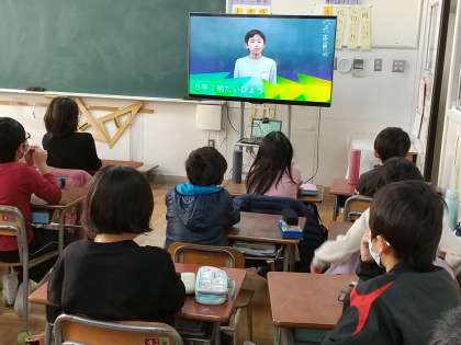 本日の放送児童朝会で、後期代表委員の紹介がありました。一人一人代表委員としての抱負を発表しました。(写真上・中)
