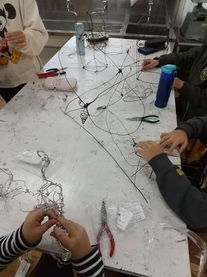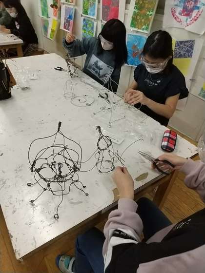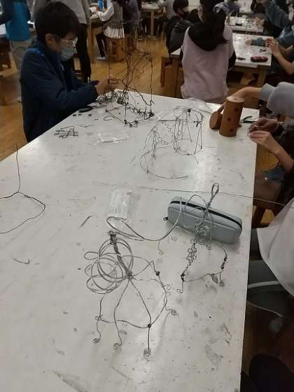 5年生が図画工作で、アルミ針金を使って立体表現に取り組んでいます。