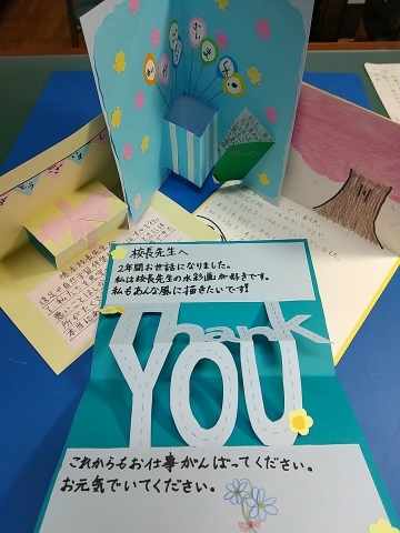 「3年間ありがとうございました。朝会の時、いつもおもしろい話や、ためになる話をありがとうございました。これからも朝会でおもしろい話やためになる話をお願いします。本当にありがとうございます。」
