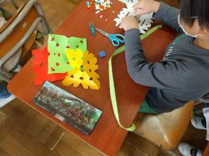 1年生が、図画工作で折り紙を使った表現に取り組んでいました。