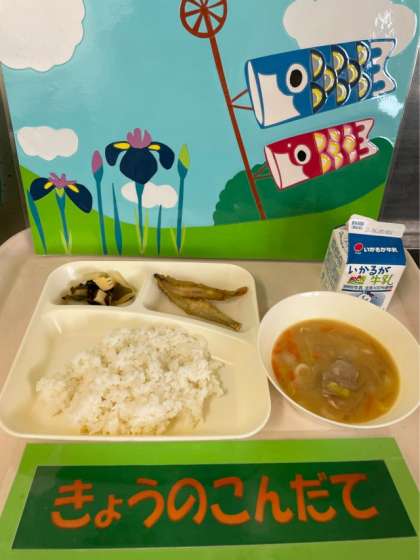 【今日の給食】 ●きびなごてんぷら ●豚汁 ●わかたけ煮 ●ごはん ●牛乳
