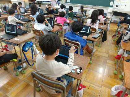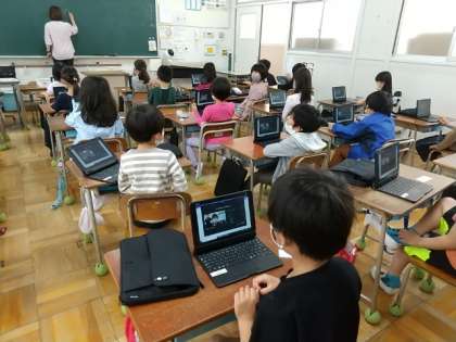 2年生が、タブレットPCの操作を学習していました。低学年のうちから少しずつ操作に慣れるようにしています。