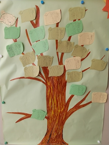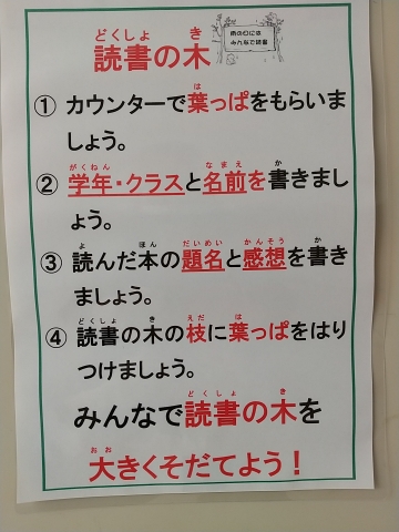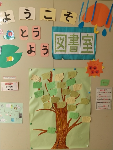 子どもたちが、自主的におすすめの本を紹介しています。読書の木がどんどん葉をしげらせ読書好きの子どもが増えていってほしいです。