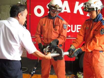 4年生は、社会の学習で天王寺消防署を訪れました。DVDや器材による切断実演、消火訓練を見たり、重い空気ボンベを背負ったり、消防車に乗せていただいたりして、「命を守る」大切な仕事にふれることができました。