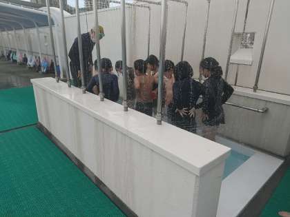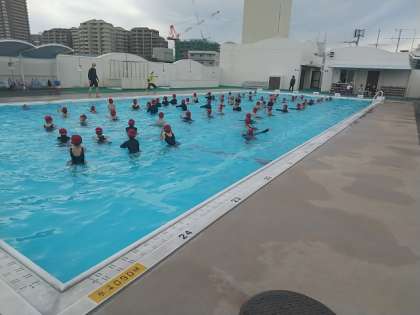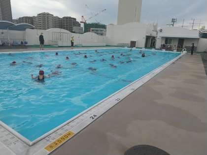 シャワーの水は冷たいのですが、プールの水はちょうどよい水温のようです。