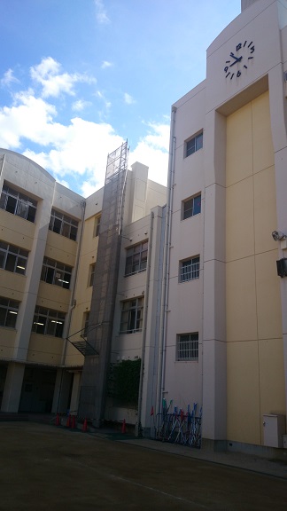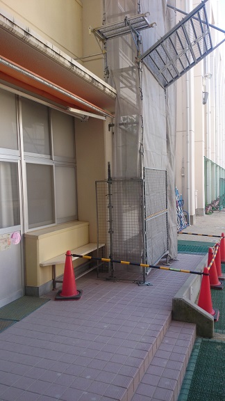全校朝会では、子どもたちに、足場のそばに近寄らないように注意をしました。
