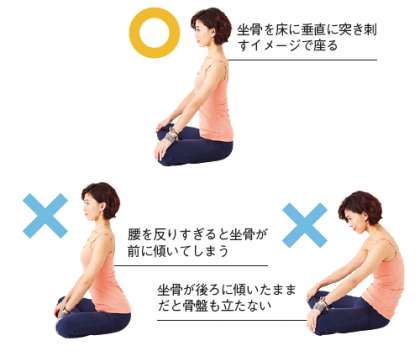 「床にあぐらをかき背すじを伸ばして座ると、お尻の左右の坐骨(ざこつ)がゴリッと床に当たります。その坐骨を真っすぐ、床下へ突き刺すイメージを頭に描いて座りましょう」