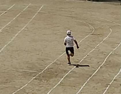 昨日の放課後、先生たちが準備した運動会用のトラックで、さっそく5年生が、トラック1周のタイムを測定していました。