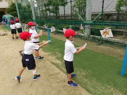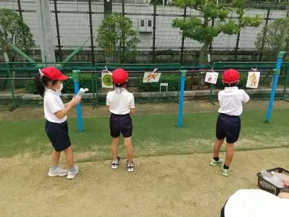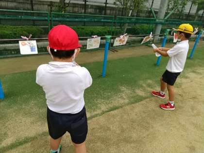 見に行くと、1年生が、水鉄砲遊びをしています。