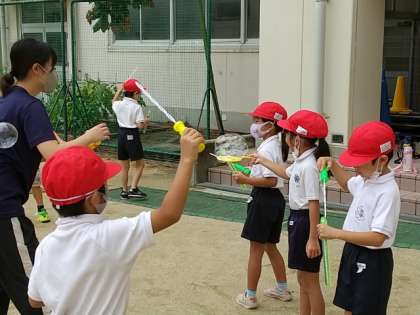 たくさんのシャボン玉が、ふわふわうかんで、とてもきれいです。