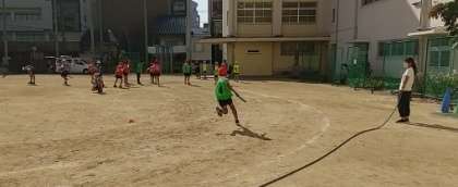 スクールサポートスタッフの職員に、散水してもらい暑さ対策をしながら、体育をしています。