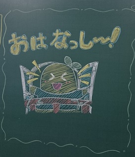 (朝の黒板には、連絡事項が書かれてあります。子どもたちは連絡帳にそれを書き写します。その連絡事項の右側に大きく書いてあったのが、この絵です。クラスによっては、詩が書いてあったり、名言が書いてあったり、一日の目標が書いてあったり、など様々です)