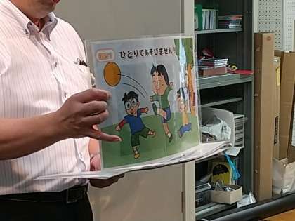 「一人で遊ばない」「お家の人に、いつ・だれと・どこで遊ぶを伝えて出かける。」などのことについて、教えていただきました。