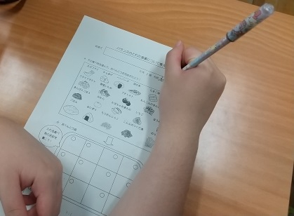 最初男子と女子に分かれて、弁当の内容を考えるようにすると、子どもたちはとても盛り上がり一生懸命弁当の内容を考えていました。