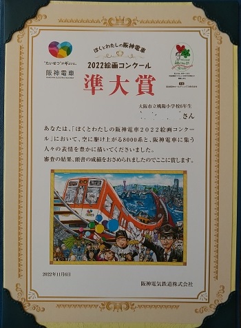 6年生男子が、「ぼくとわたしの阪神電車2022絵画コンクール」で、大賞に次ぐ準大賞に選ばれ表彰されました。