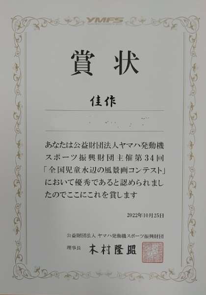 6年生女子が、「全国児童水辺の風景画コンテスト」で佳作を受賞しました。
