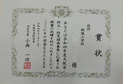 2年女子が、「大阪市防火・防災図画」で佳作に選ばれました。 おめでとうごさいます。