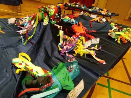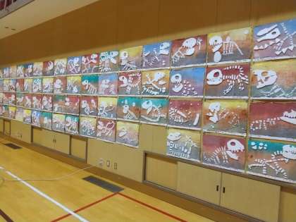 桃陽小学校2階体育館で、作品展を開催しています。