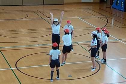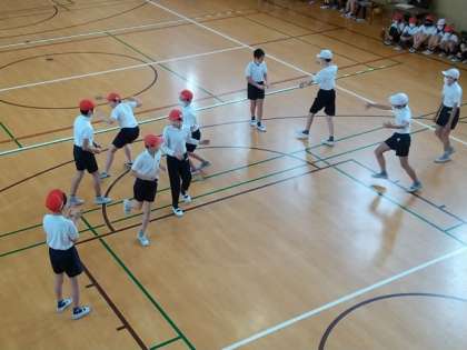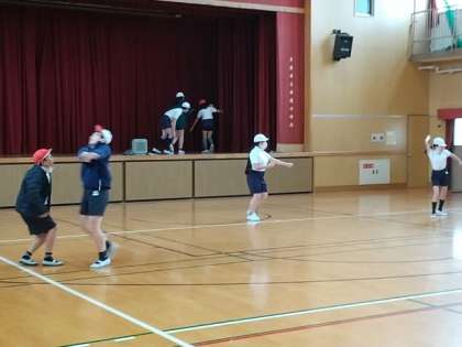 表現の学習で、スポーツなどの様子を音楽に合わせて、演じているところです。