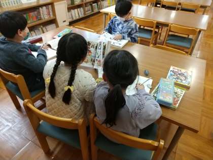 2年生が図書館で、本で調べてまとめる学習をしていました。