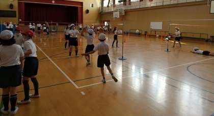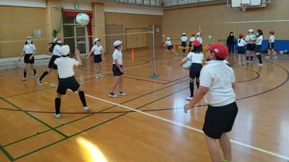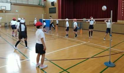 4年生が、ソフトバレーボールを使ってパスの練習をしています。
