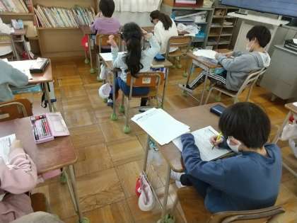 2年生の教室では、1年間の学習のまとめのテストをしていました。