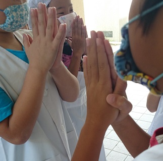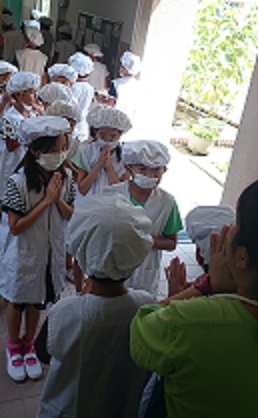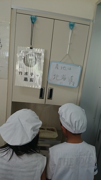給食室に入ると、陳列ケースの中の配膳例をしっかり見て教室に戻ります。