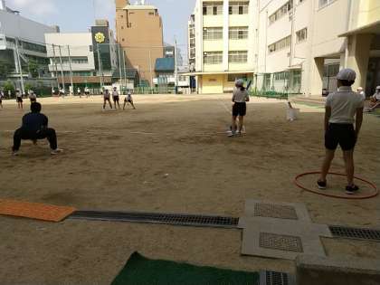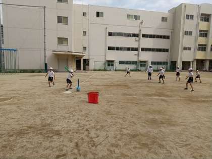 4年生が体育でTボール(ベースボール型ゲーム)をしています。