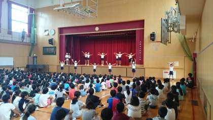 運動会に向けて、運動委員がラジオ体操の見本を見せました。