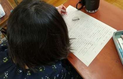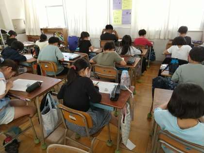 4年生の教室では、国語のテストをしていました。先ほどの1年生のテストに比べると、文字もずいぶん小さく、問題数もとても多いです。
