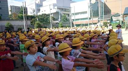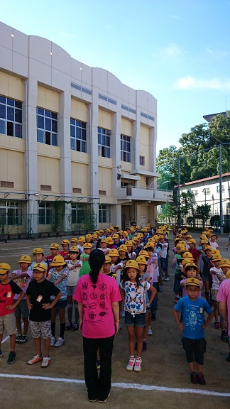 いつもは体育館で行う全校朝礼ですが、朝礼後に運動場の石拾いを子どもたちがするので、今日は運動場に出ました。