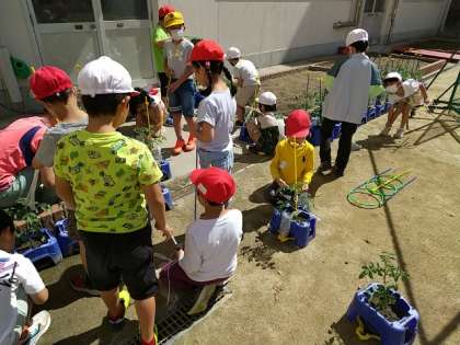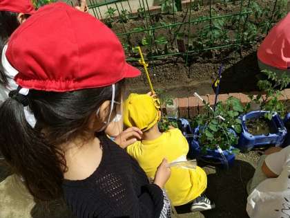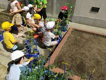 2年生の子どもたちが、先日植えたミニトマトの鉢に支柱を立てています。
