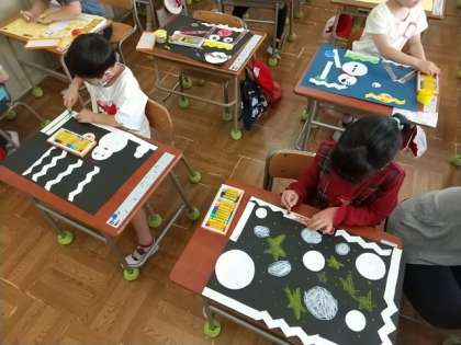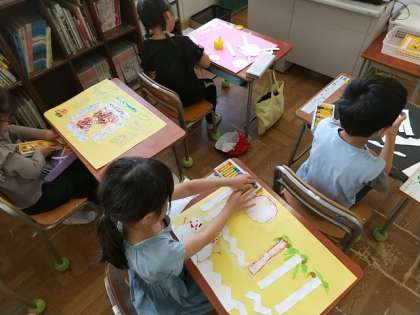 1年生が、図画工作で、はさみ・のり・パスの使い方を学習していました。