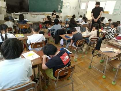 教室の前では、担当の子どもが、文例などを読み上げほかの子どもたちが復唱しています。担任の先生は、子どもたちの書いた文字の点検や書く姿勢について、よいところをほめていました。