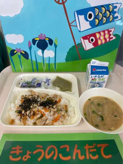 【今日の給食】 ●かやくごはん ●みそ汁 ●まっ茶ういろう ●牛乳