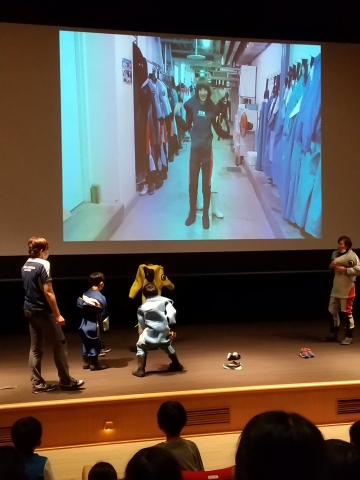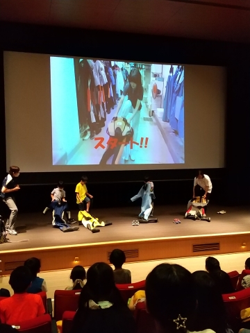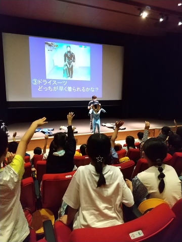 飼育員さんが、水槽の中に入って仕事をするための、ドライスーツを着る体験では、映像に映し出される飼育員さんとどちらが早く着られるか競争しました。