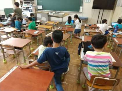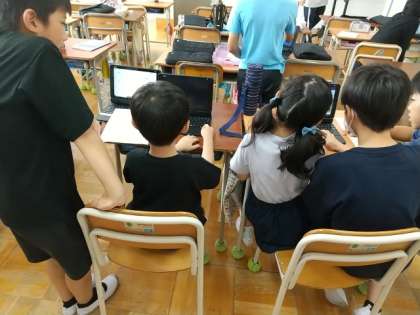 異学年交流(特別活動)で、6年生が1年生にタブレットPCの使い方(起動のさせ方や簡単なソフトの操作、シャットダウンの方法など)を教えてあげていました。