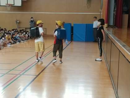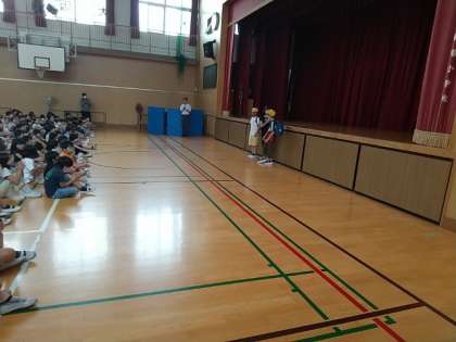 今日の全校朝会では、運営計画委員の児童が、児童会の目標やあいさつ週間の取組について発表してくれました。