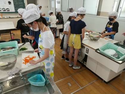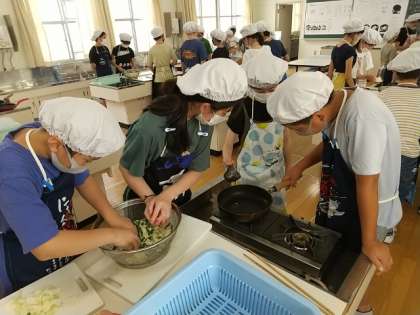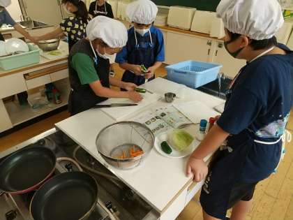 6年生が調理実習に取り組んでいます。材料を見ると野菜炒めかな?