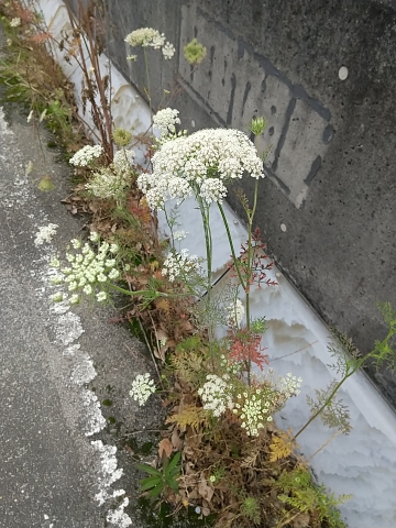 駅を出たすぐの道路脇に、小さな白い花を無数に付けている野草が、群れ咲いていた。