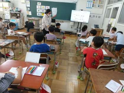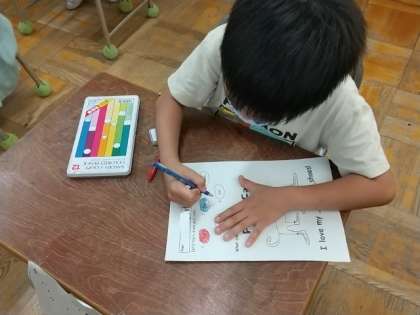 学習カードに、英語で言われた色をぬっていく活動でしたが、英語の指示を聞いてきちんとぬることができていました。