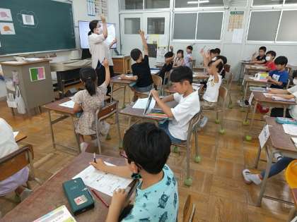2年生が、C-netの先生に、「色」を英語で言う言い方を教えていただきました。
