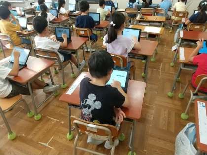 1年生がタブレットパソコンで、デジタルドリルの学習に取り組んでいます。